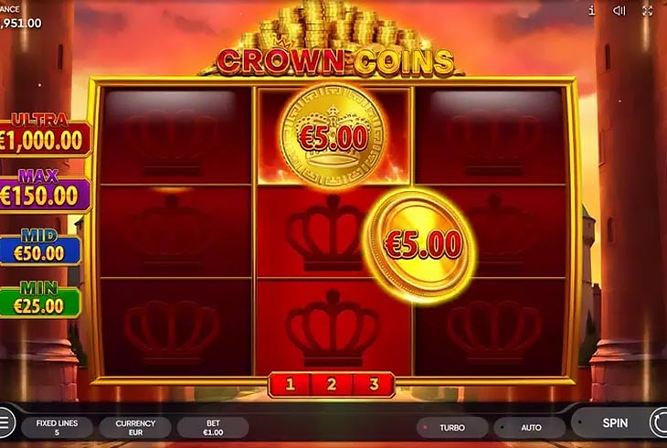 Crown Coins to propozycja Endorphina Crown Coins adresowana do graczy, którzy cenią czytelność i stabilny rytm sesji oraz wyraźny punkt kulminacyjny w bonusie monet. Crown Coins slot wykorzystuje układ 3x3 i 5 linii wypłat, więc rozkład symboli można ocenić w ułamku sekundy bez rozpraszających dodatków.