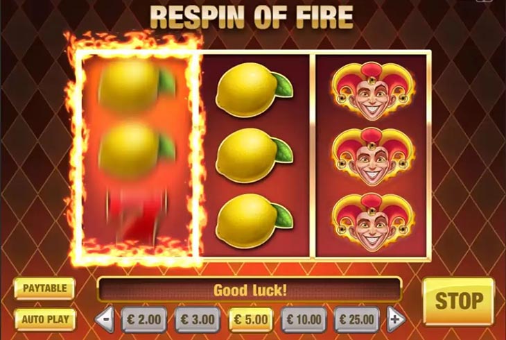 1. Re-spin of Fire - gdy na dwóch bębnach widać ten sam symbol, a trzeci jest inny, gra daje dodatkowy respin, który może domknąć układ;