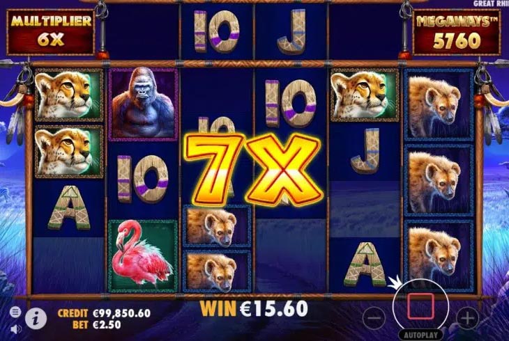 Great Rhino Megaways to produkcja Pragmatic Play, która przenosi graczy na sawannę pełną dzikich zwierząt. Jest to rozwinięcie klasycznego Great Rhino, tym razem w wersji opartej na licencji Megaways od Big Time Gaming.